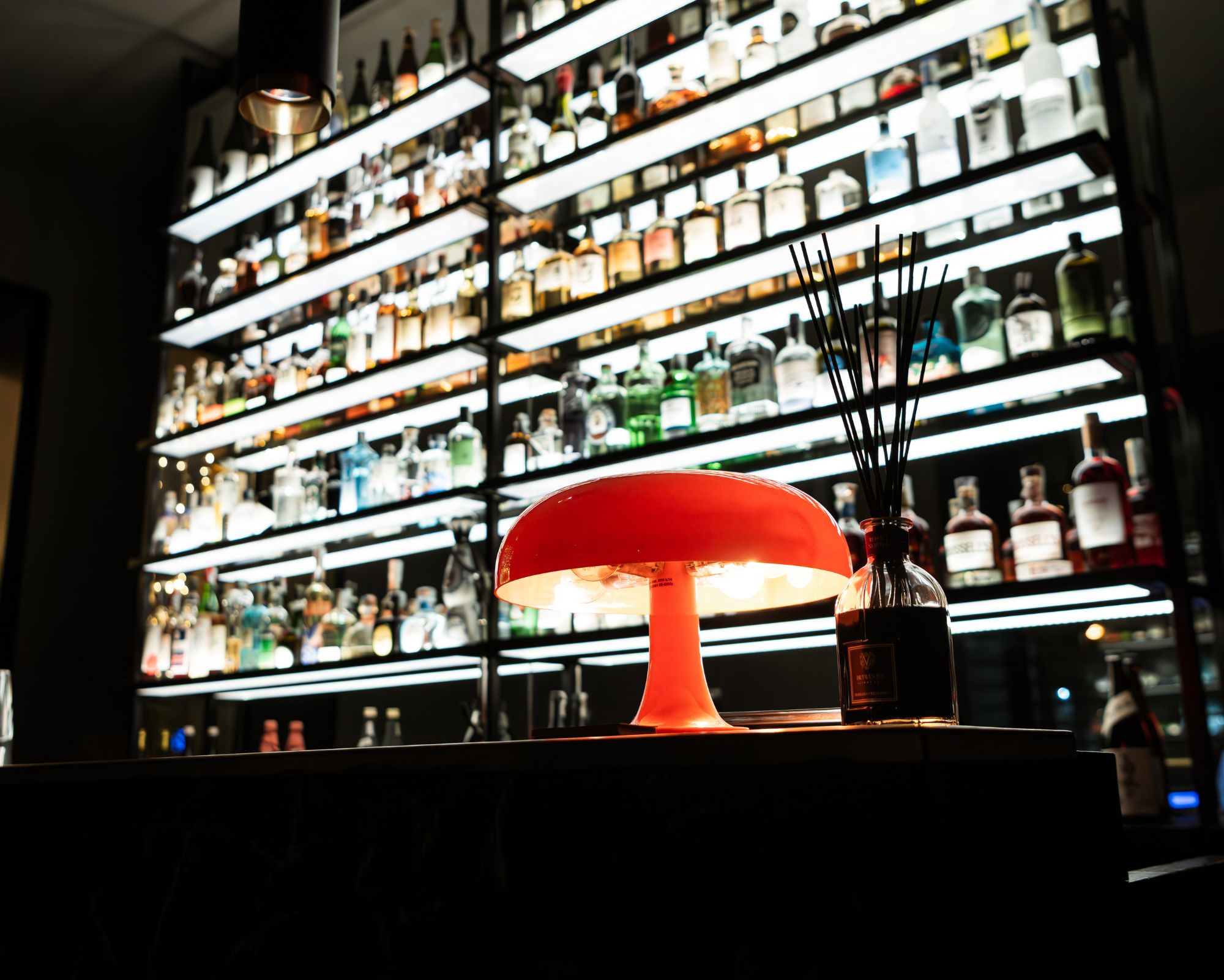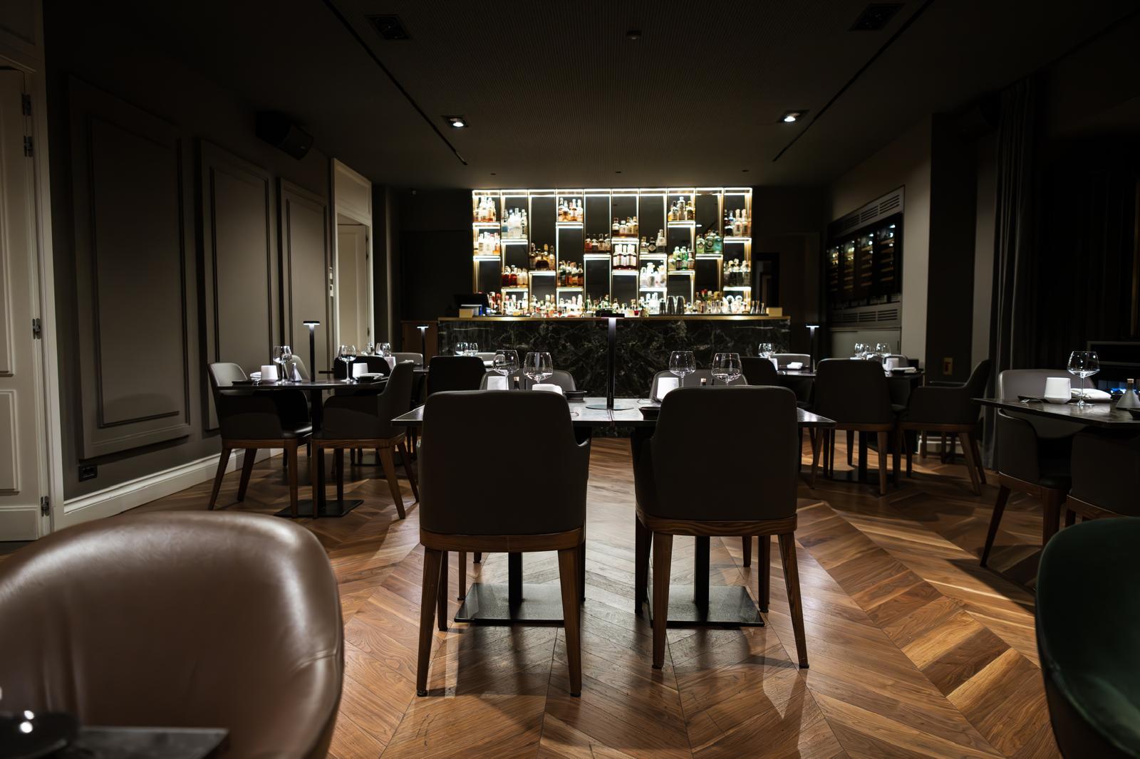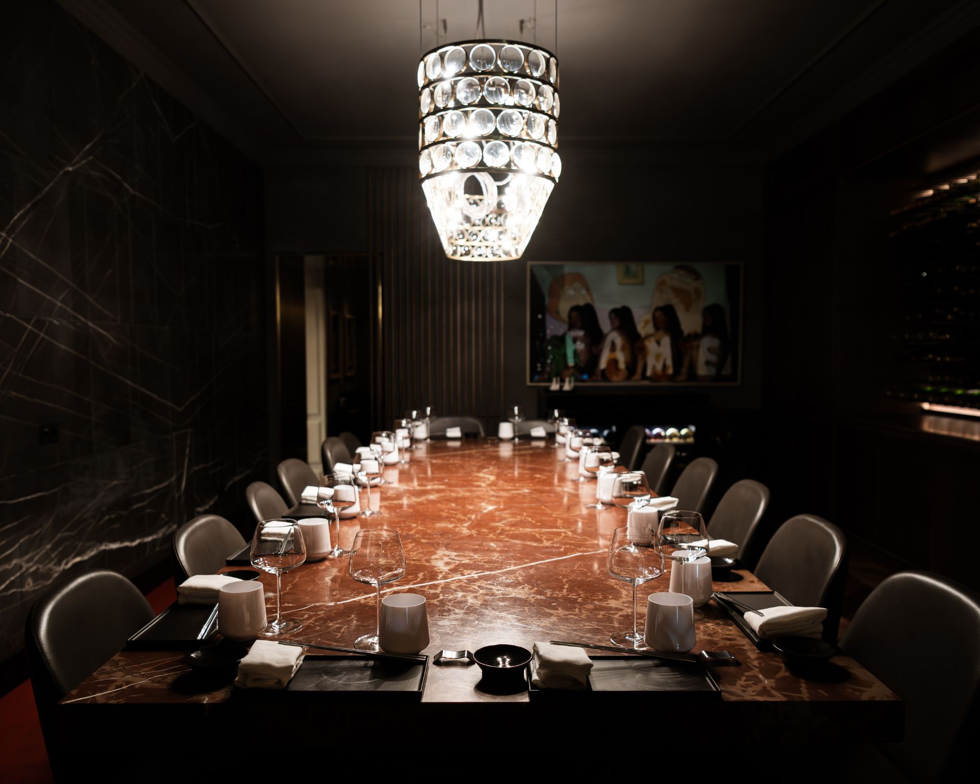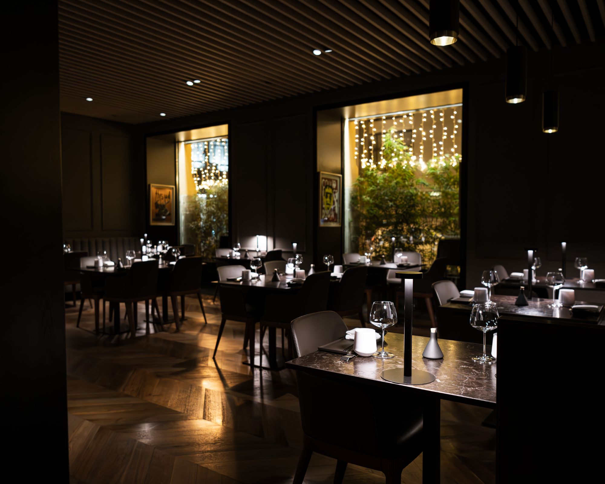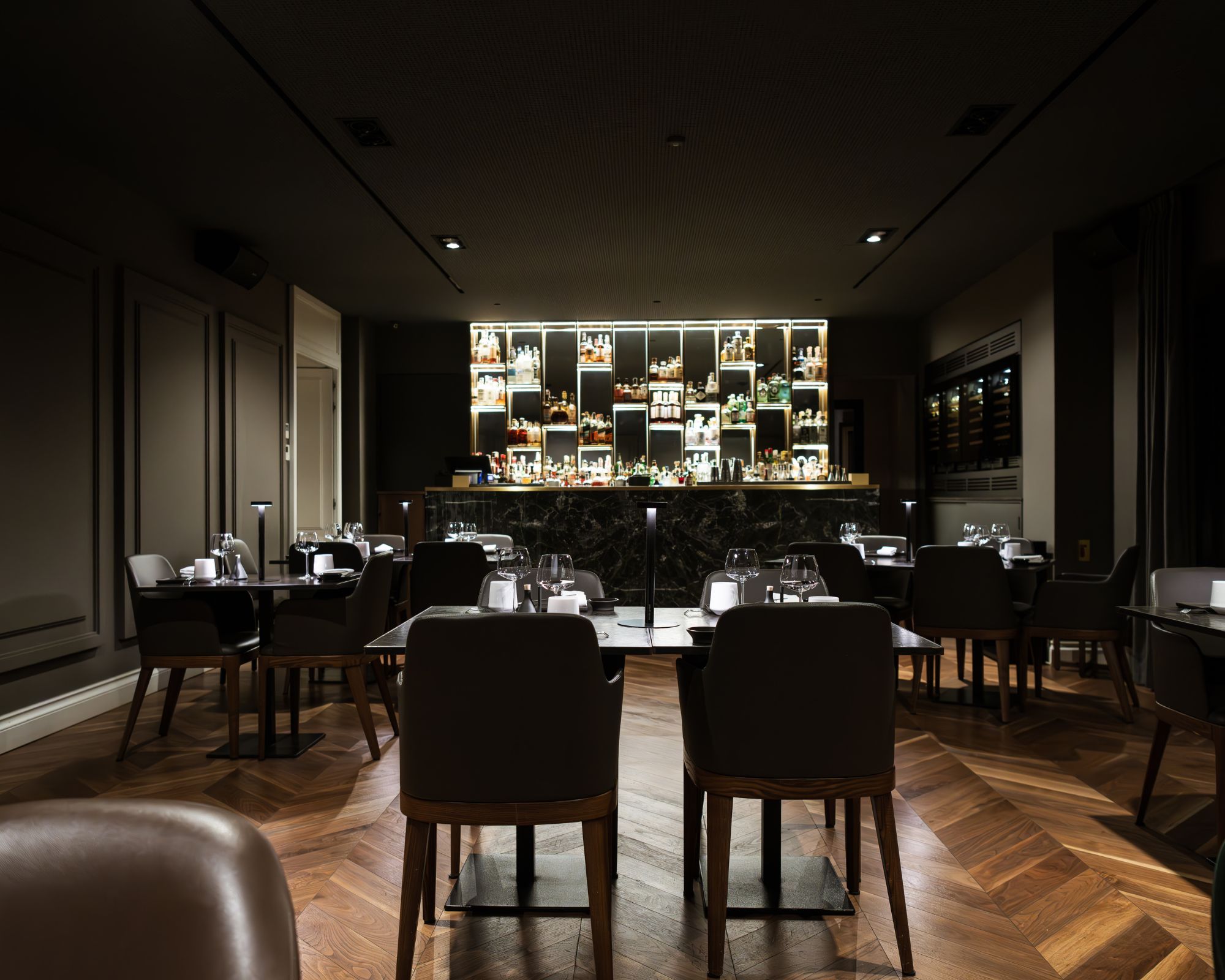 Il ristorante si estende su una superficie di 400 mq, con 80 coperti distribuiti su due piani dallo stile minimale ma contemporaneo. L’esperienza è arricchita da due grandi cocktail bar: uno al piano terra, caratterizzato da una bottigliera alta 4 metri, e un secondo al primo piano, per un totale di oltre 500 referenze. Al primo piano si trova anche una sala fumatori con affaccio su via Depretis, impreziosita da una maestosa parete vegetale. Sempre al primo piano, è presente una sala privata con un elegante tavolo in marmo Collemandine rosso, che può ospitare fino a 16 persone, ideale per cene aziendali e feste private.